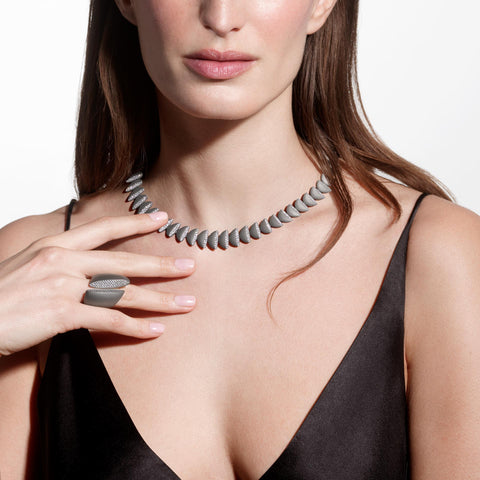 The iteration of the Eclisse element compose the necklace, a form embracing the body with sensual softness.