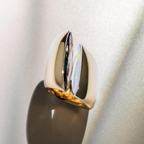 A slanted ring, in pure Vhernier style. Its generous volume is transvered by a clear cut: a singular, sculptural gesture. In the Eclisse Endless the elements are iterated, to create a hypnotic rythm.