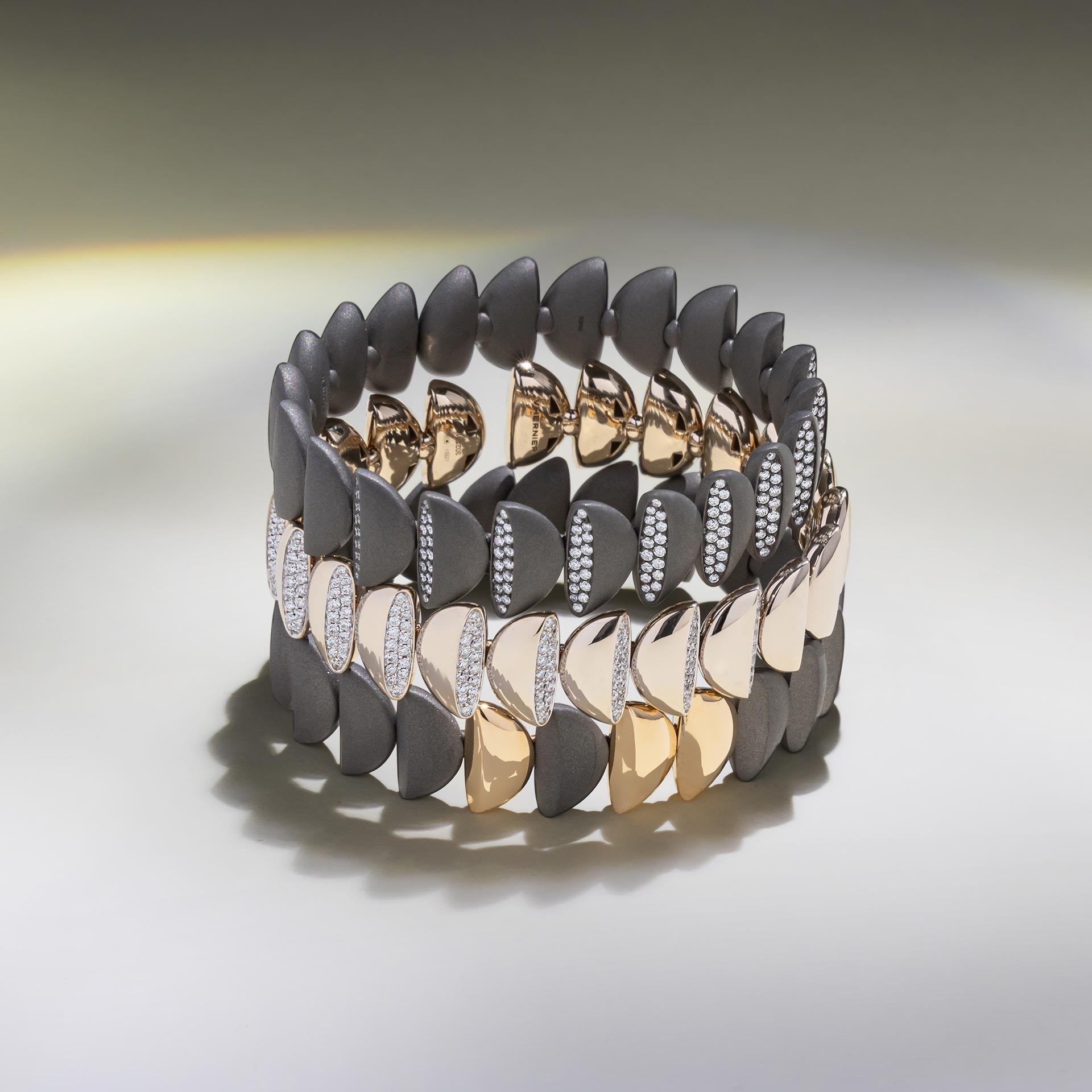 The bracelet further develops the original concept, multiplying the distinctive crescent shape that characterises the collection. The elements are repeated, suggesting the possibility of infinite expansion.