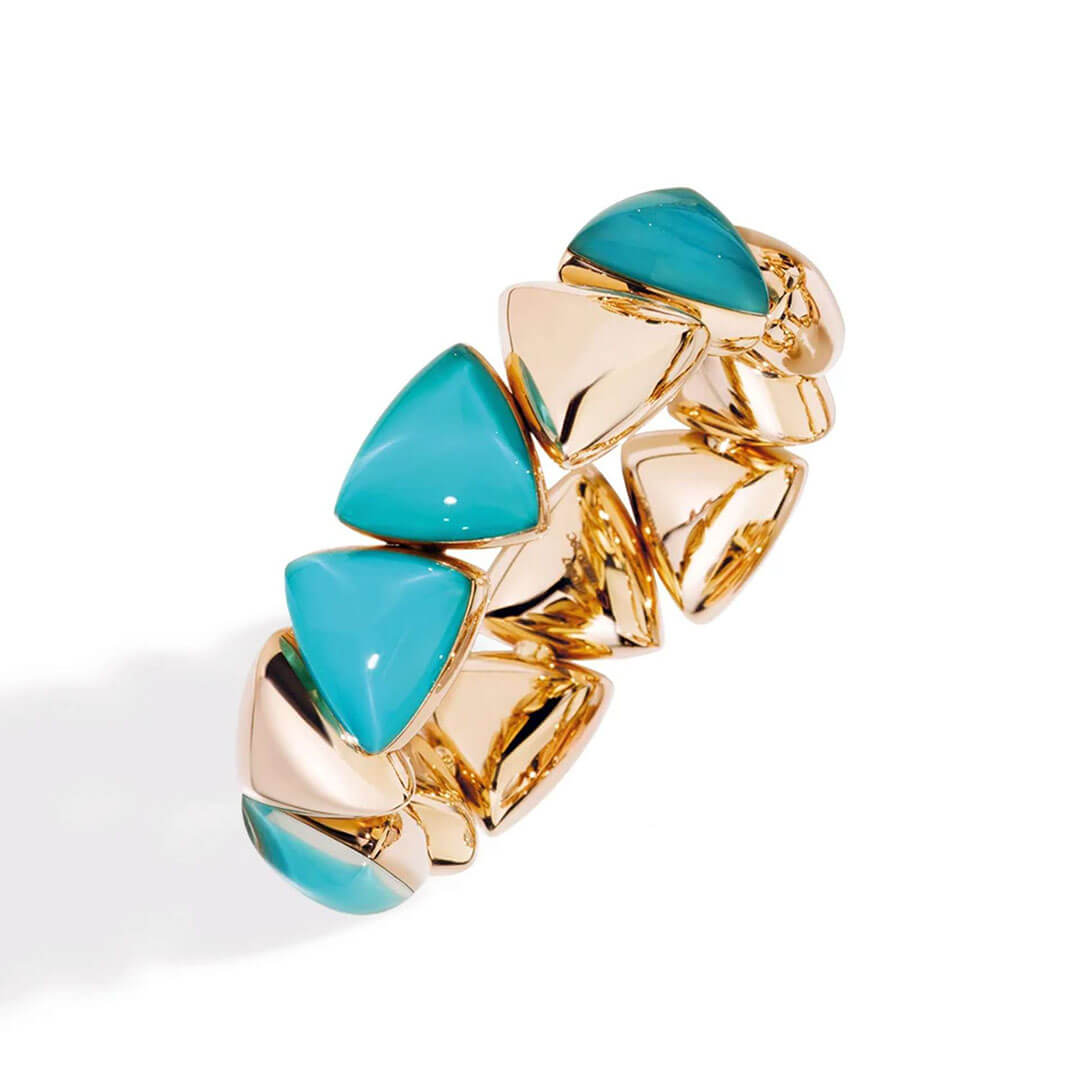 Gems such as jade, lapis lazuli, turquoise, are layered with mother-of-pearl and rock crystal to create extraordinary colours, which continue the sculptural design of the jewellery, merging into a single, continuous element with the gold.