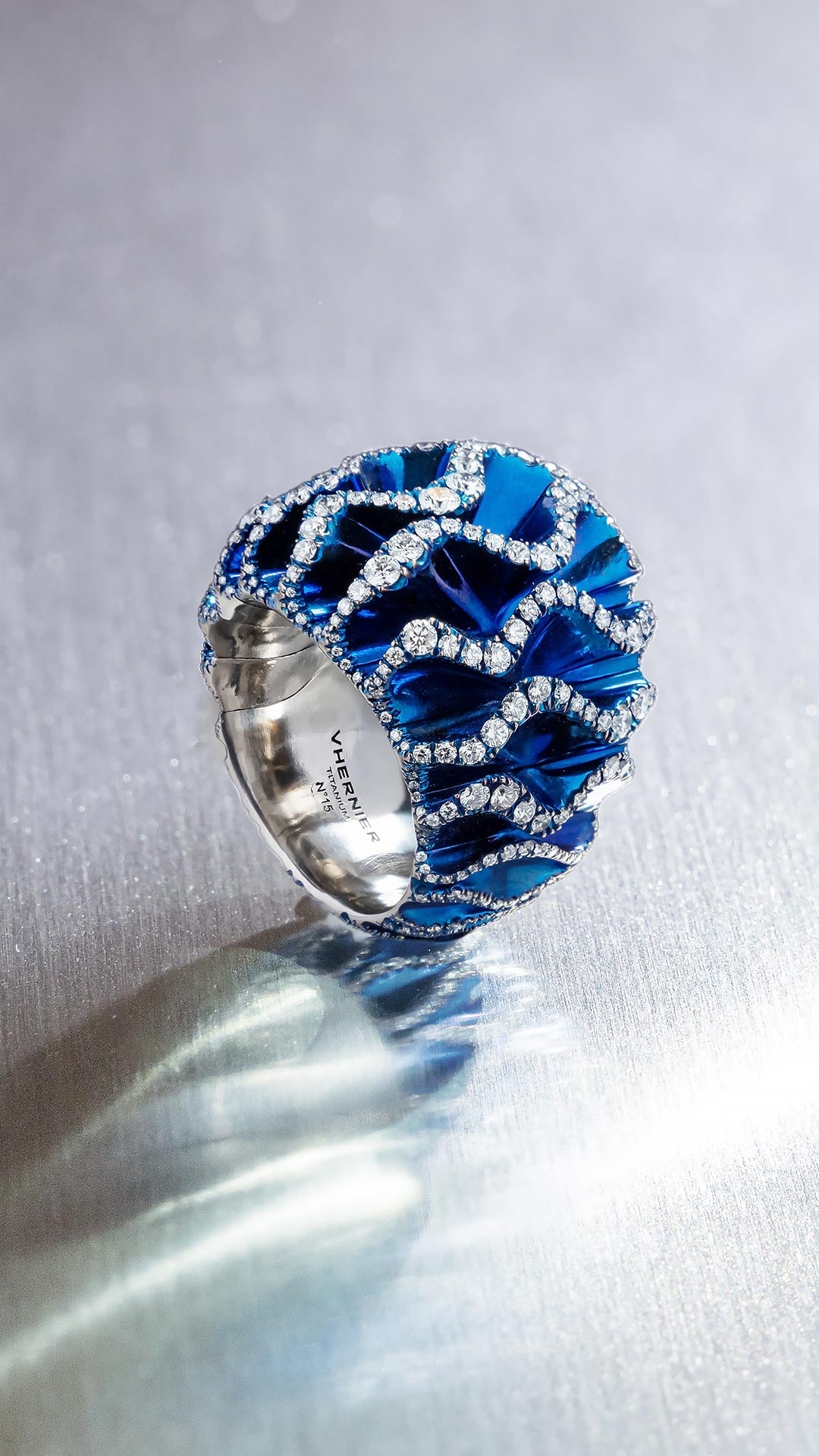 Diamonds are meticulously set along the crests of the waves, catching and reflecting light to create a luminous rhythm. The contrast between the smooth, coloured titanium surfaces and the sparkling stones accentuates the sculptural impact of each piece, while the interplay of volume, light, and colour highlights Vhernier’s distinctive approach to design and craftsmanship.