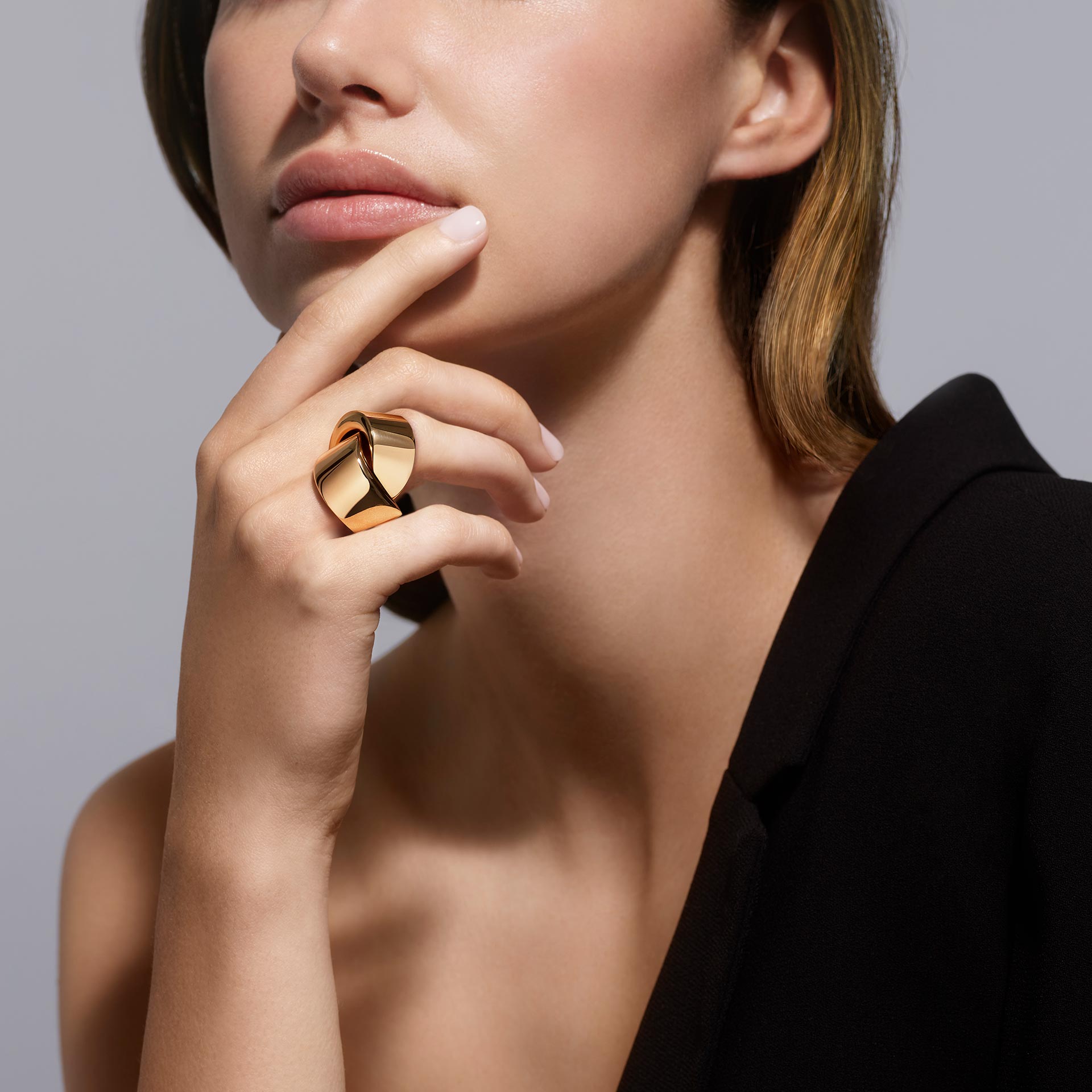 The exceptional purity of its shape, the softness with which it caresses the skin, the energy given by the dynamic shape of the band that wraps around itself, and the mystery of its construction embody the essence of Vhernier's design language.