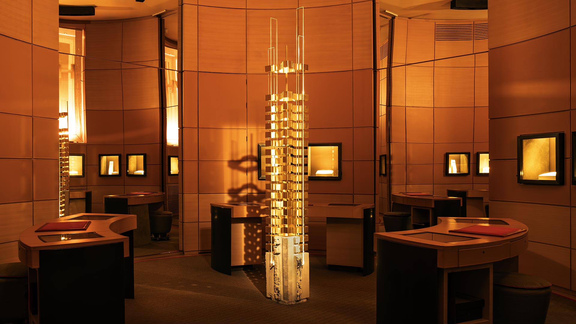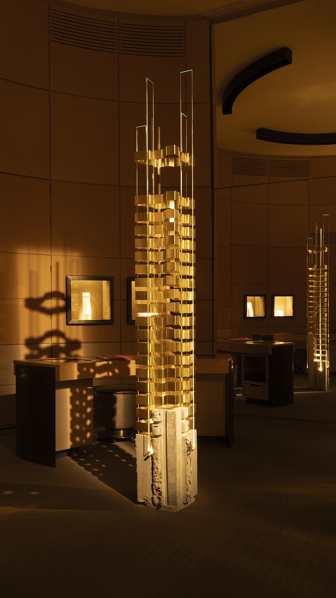 Il disegno luminoso proiettato a terra trasforma l’ambiente in una meridiana artistica. Il variare delle luci muta la percezione dei volumi, generando un paesaggio sensoriale in costante divenire, in cui la torre diventa il baricentro tra precisione orafa e respiro architettonico.