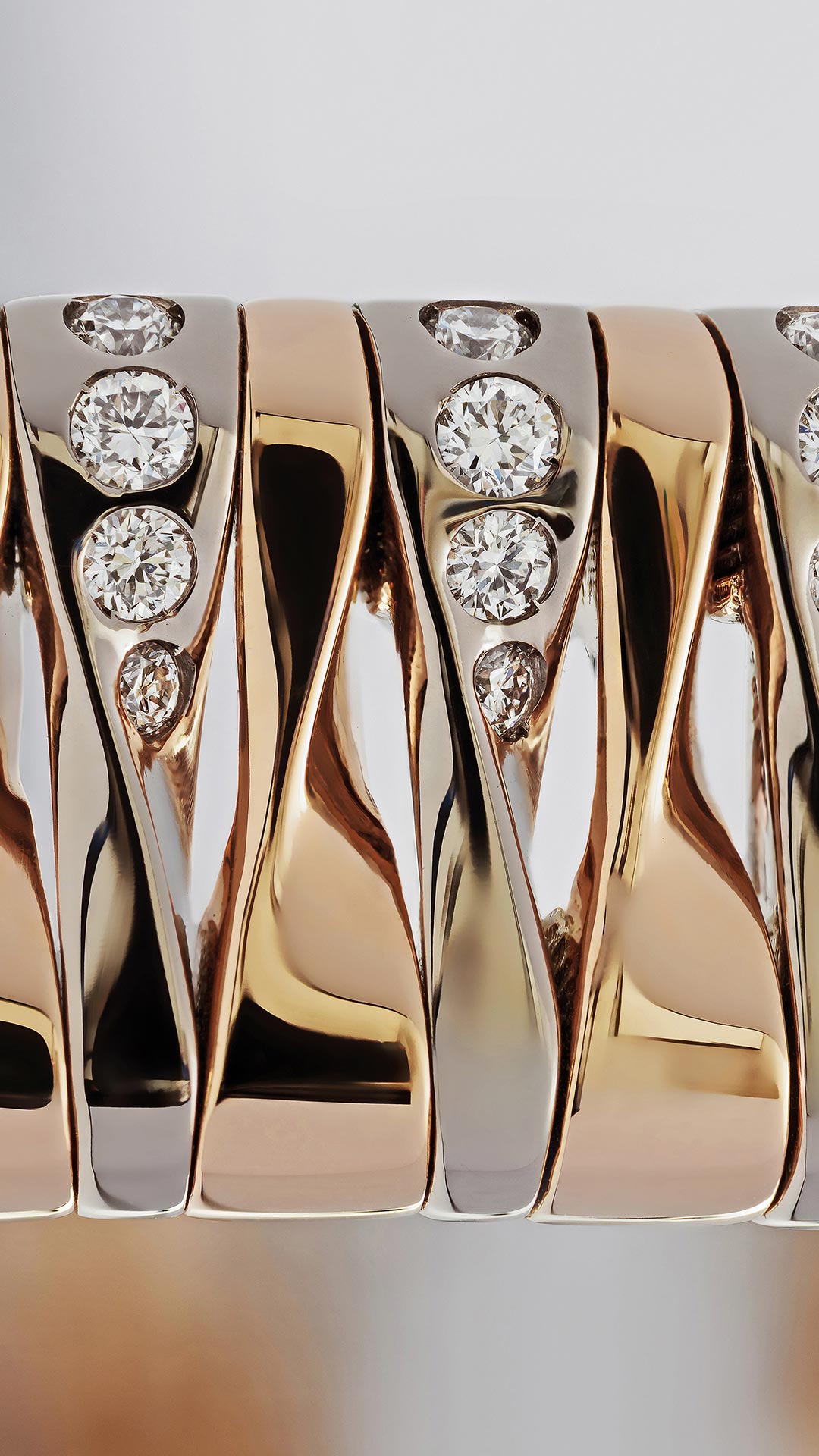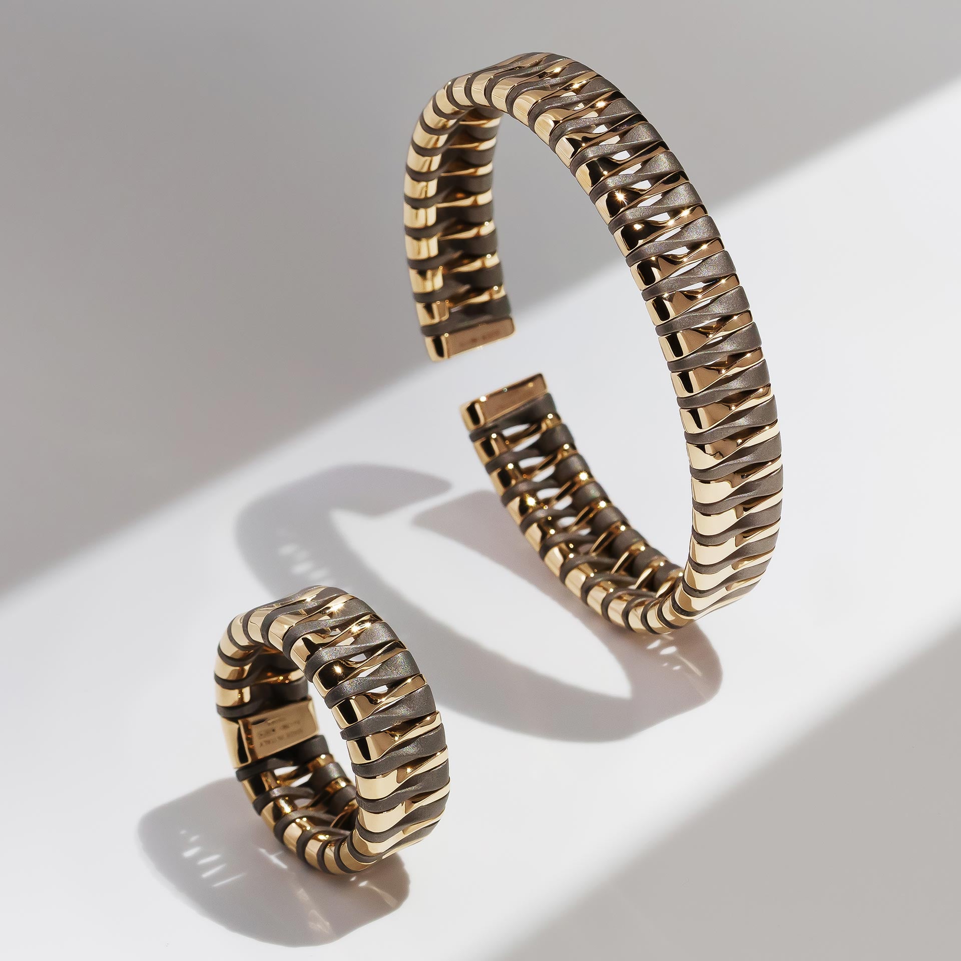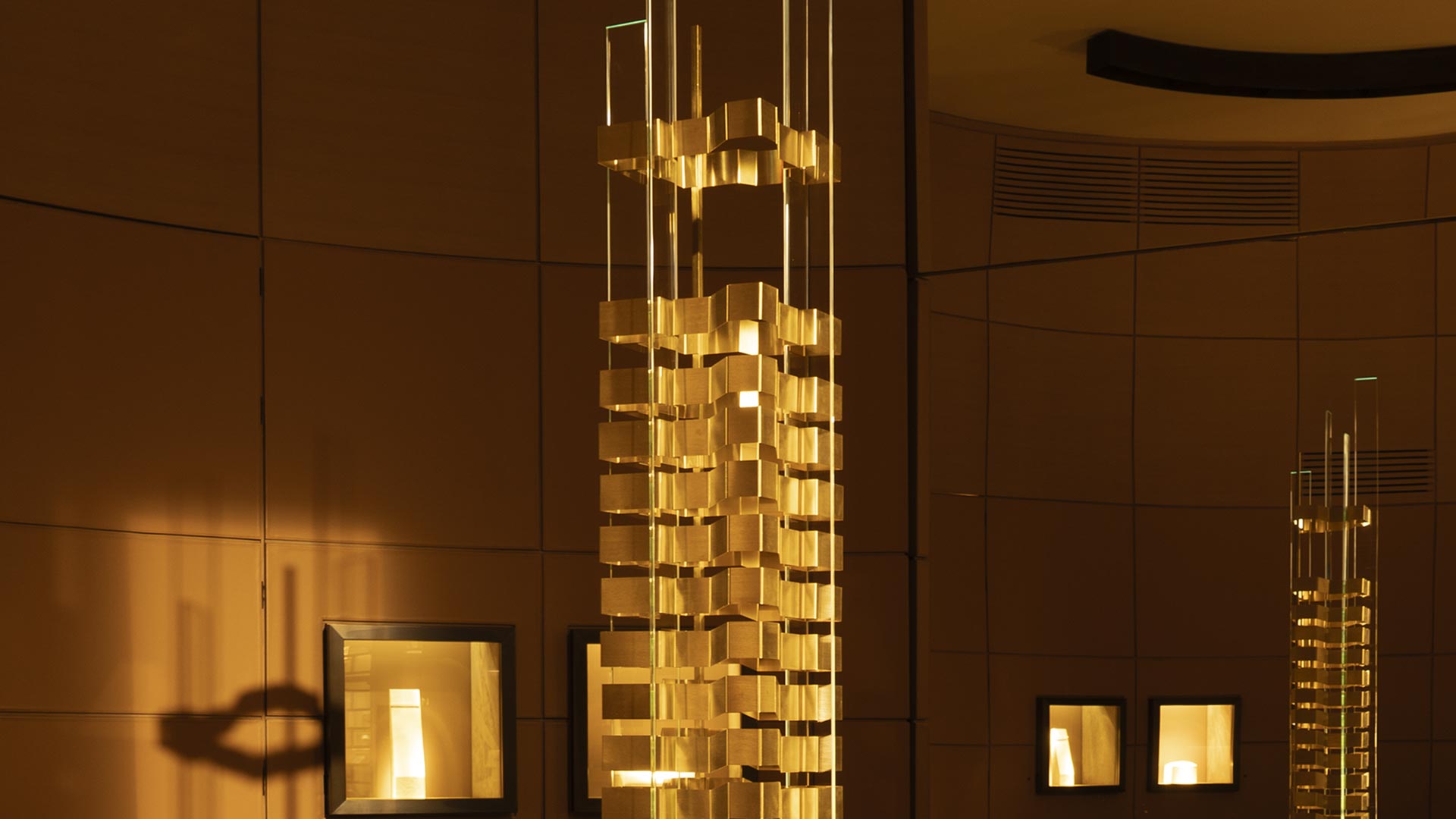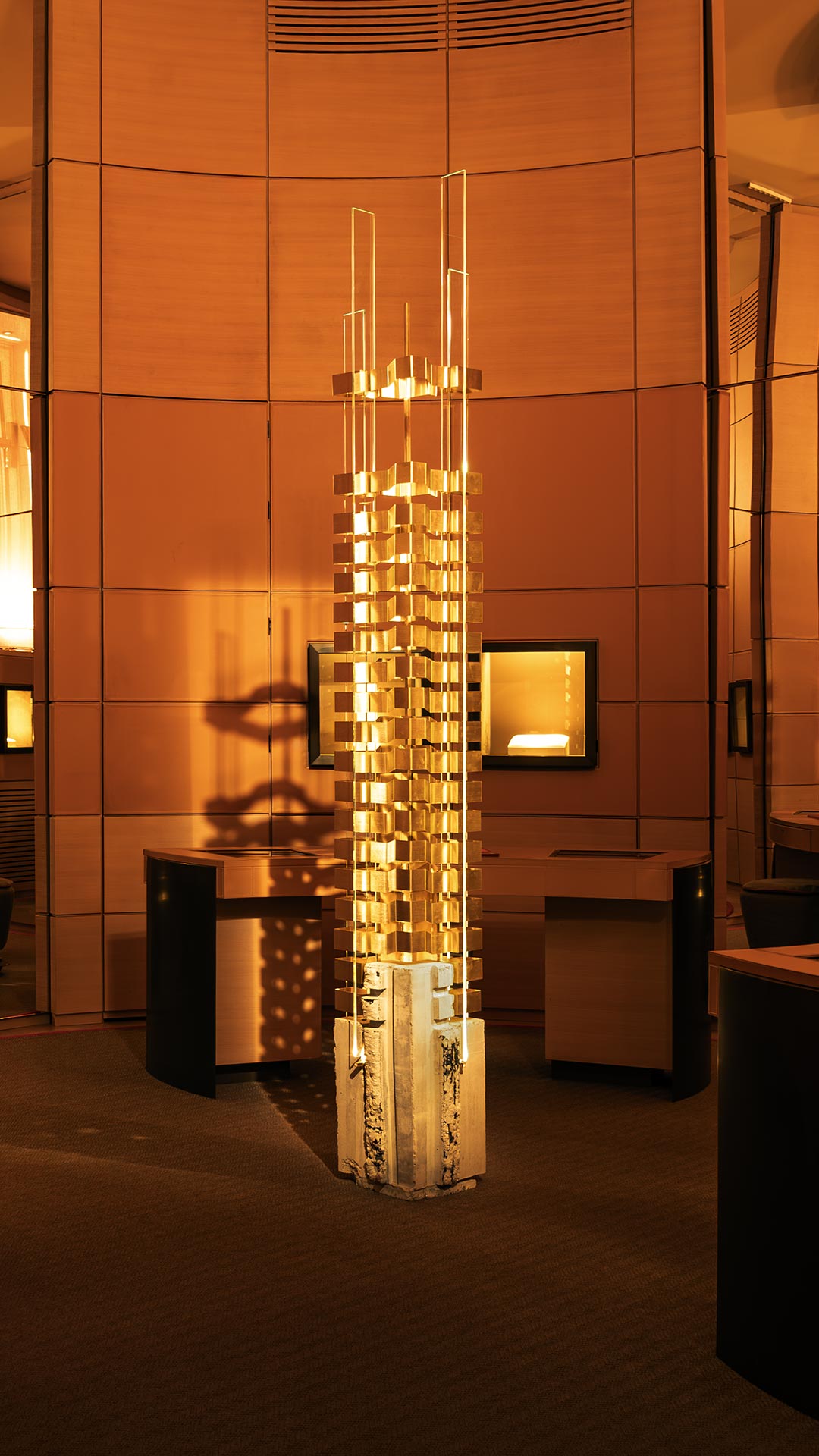 Ogni "piano" in ottone della torre riproduce la stratificazione e la curvatura tipica delle creazioni Vhernier, dove l'oro si fa ritmo e la materia si apre alla luce. Come nel gioiello la forma accoglie il riflesso, così la scultura cattura e rifrange i raggi in un alternarsi di bagliori e ombre, fissando l’istante del crepuscolo in una dimensione monumentale.