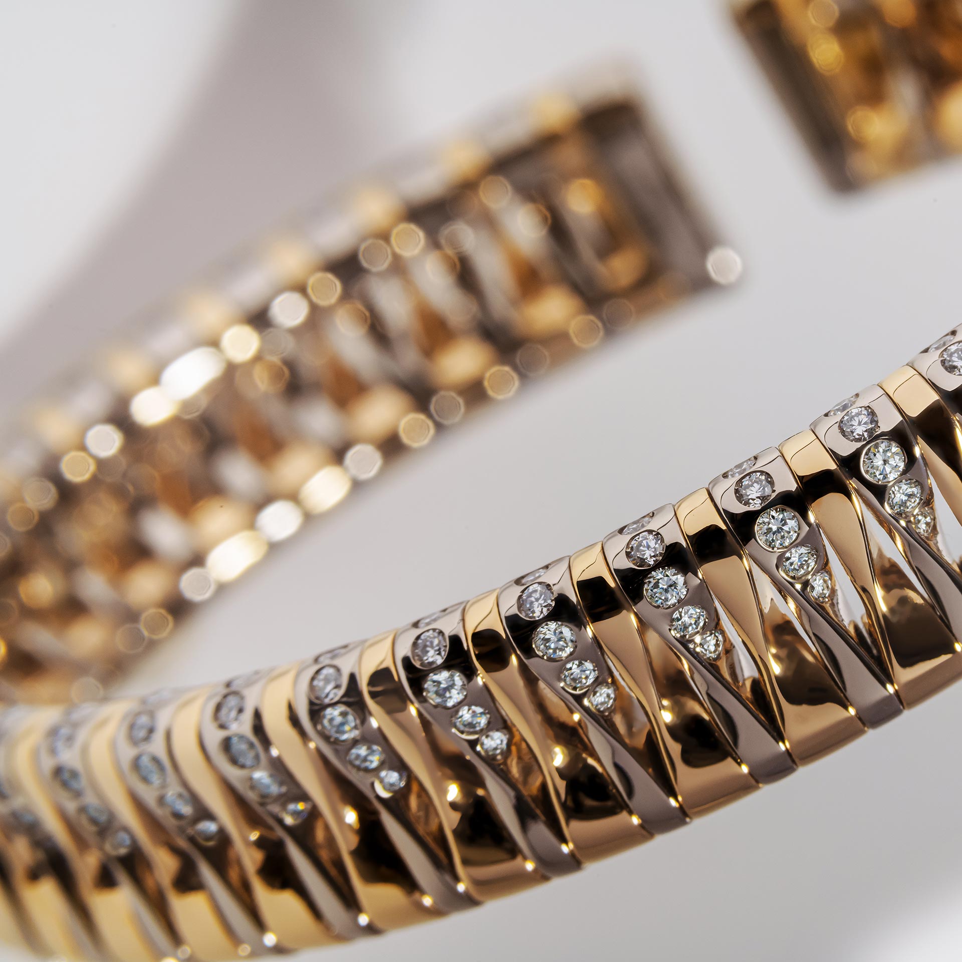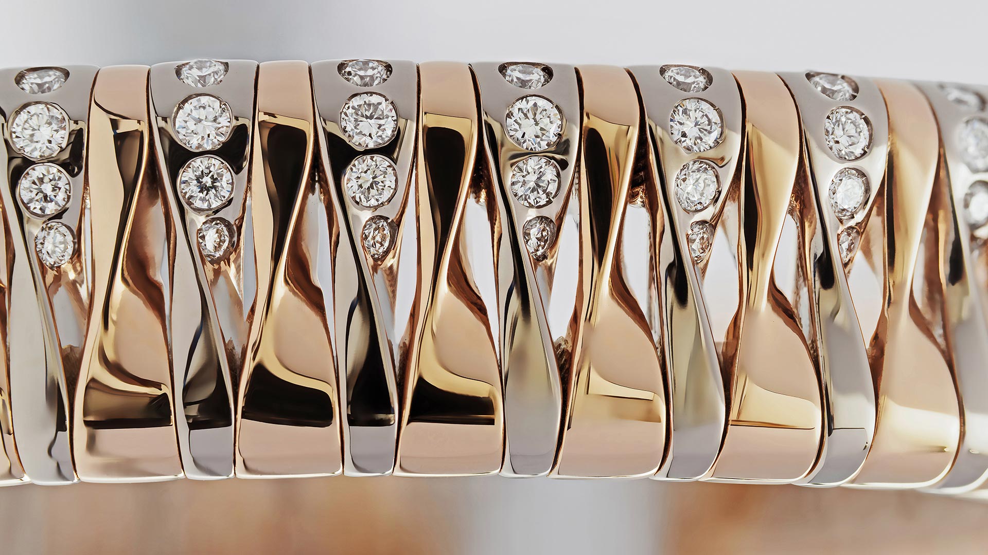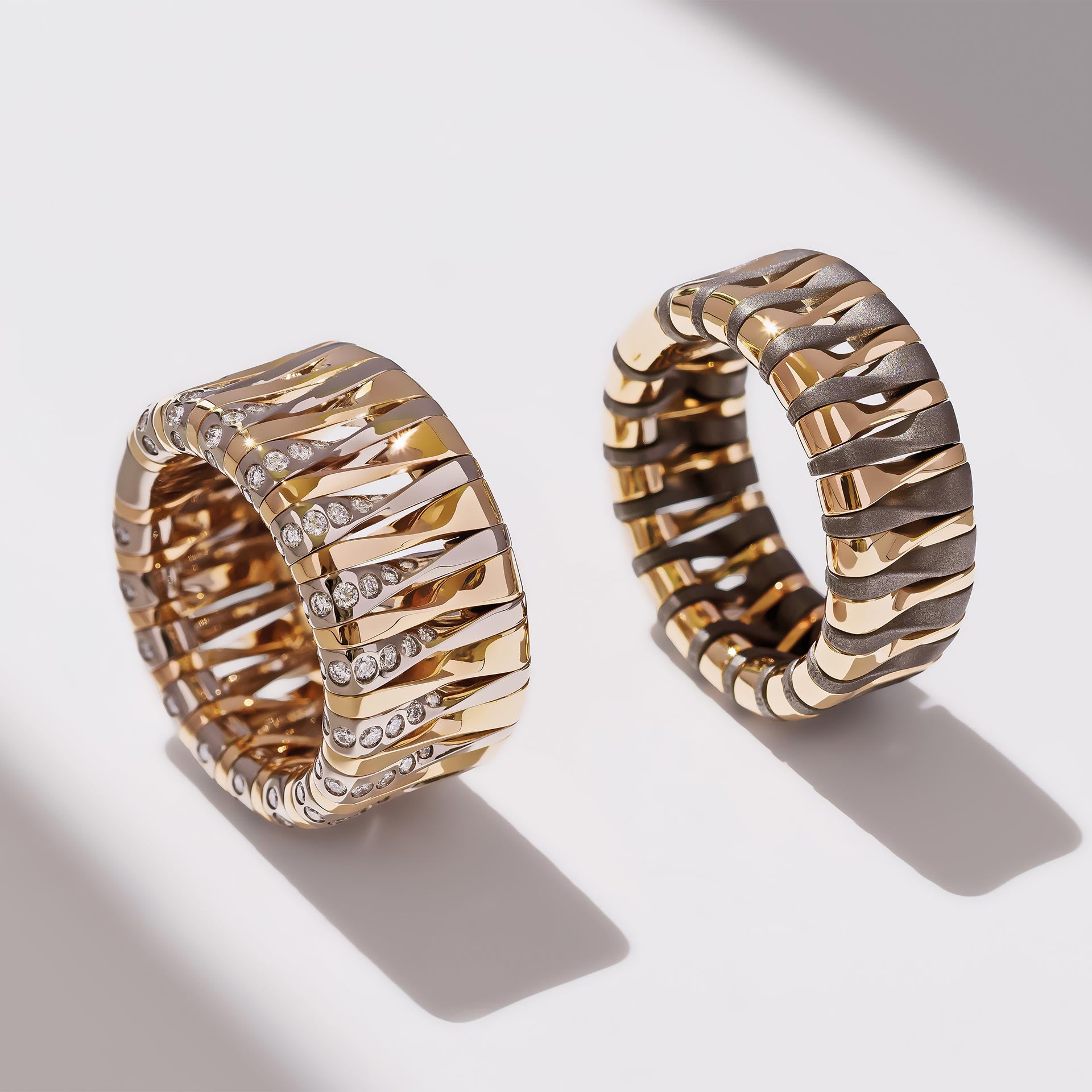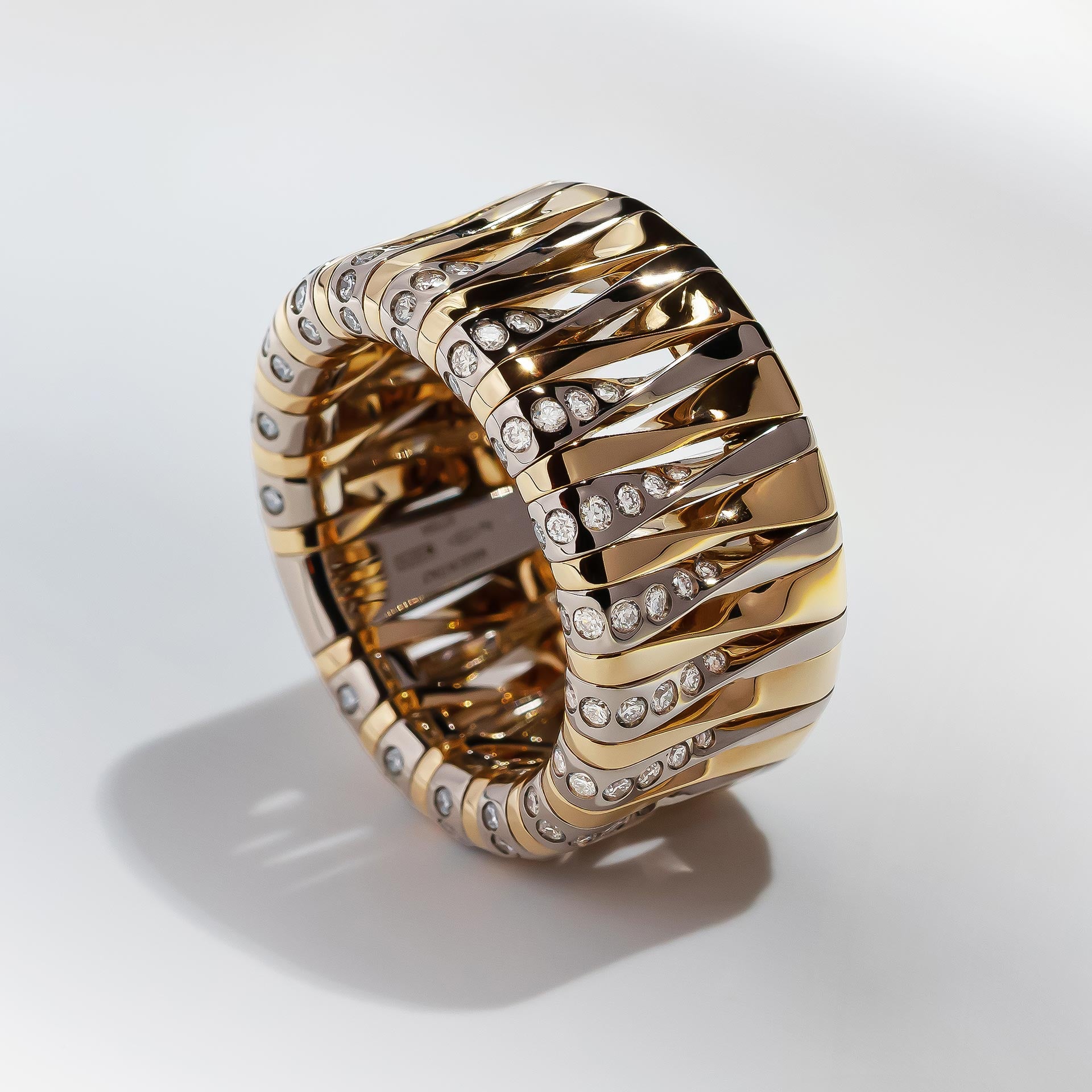 Al centro, la scultura site-specific di Andrea Grandi agisce come un corpo dinamico che seziona lo spazio: la sua struttura a lamelle sovrapposte non è solo un esercizio formale, ma una proiezione macroscopica del gioiello stesso