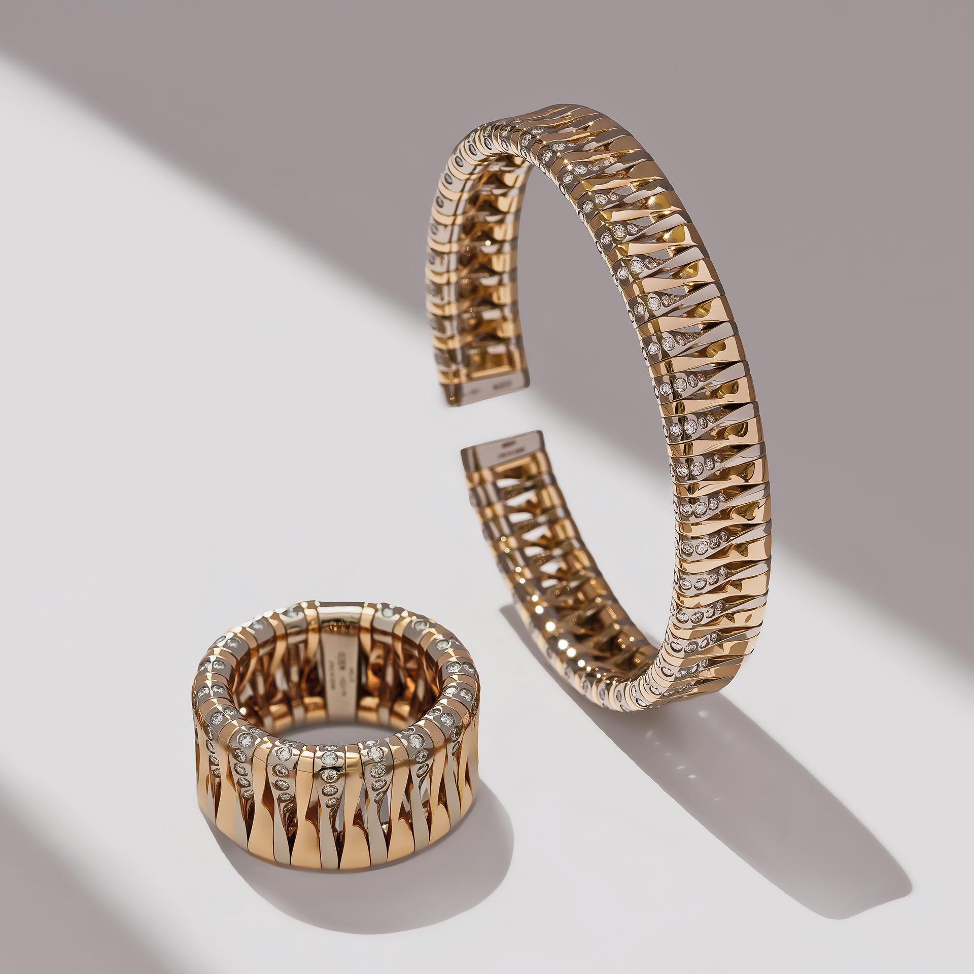 L’allestimento traduce la collezione in architettura, sintetizzando il dialogo tra luce, materia e ritmo.